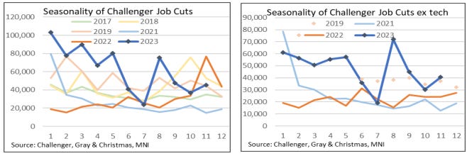 11月份挑战者(Challenger job cuts)公司裁员数据显示裁员45.5k,同比下降41%,是自22年2月以来的最大同比下降。与22年11月高科技裁员激增时期的52.8k对比,23年11月份高科技裁员为5k,减少了90%。而不包括高科技的裁员在11月同比增长了68%,零售业裁员最为显著,为6.5k。全行业裁员季度趋势显示了进一步的稳步回调:第一季度同比增长390%,第二季度同比增长163%,第三季度同比增长106%,截至10月至11月同比减少16%。(下图中比较橘色线2022年和深蓝色线2023年高科技行业与非高科技行业裁员情况)
