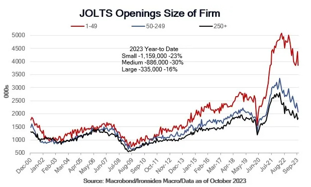 贝弗里奇曲线(beveridge curve)经过一年的近乎垂直上升以后,现在正在向右下方弯曲。如果理论有效的话,就业市场需求在减弱,失业率就应该升高。值得注意的是,中小企业(250名以下雇员)的“职位空缺”正在带头下降。这些企业通过银行系统以浮动利率债务融资。借款利率的急剧上升和银行信贷渠道的收紧已经使得这些企业对劳动力需求减弱。另外,劳动数据局(BLS)用来预测的“生死”模型(企业创建与倒闭)的企业倒闭数据缺失,高估了小企业的就业,这个部分的错误需要一段时间更正。