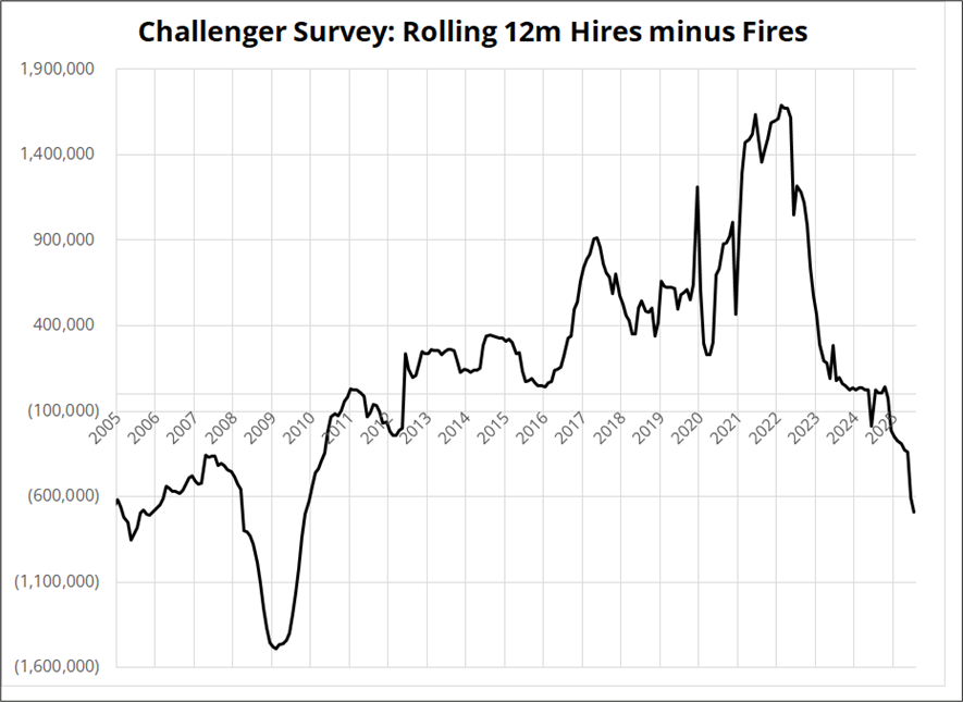 与此同时,美国经济数据仍然处在一片沙漠之中。没有了政府数据,这倒好,反而让市场更关注一些私人公司的数据,这些数据往常大家并不那么有兴趣。比如Challenger每月报告一次招聘和裁员数字,下面这张图是过去20年连续12个月招聘人数减去裁员人数。图上显示净招聘人数是负的。