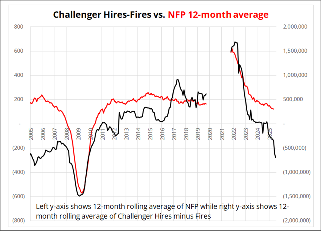 笔者好奇,这个Challenger的数据,历史上和非农就业数据究竟是个什么关系。网上已有同行做了这项工作,将Challenger数据与12个月非农就业数据的平均值对比(见下图)