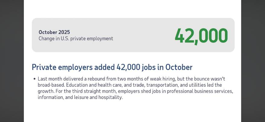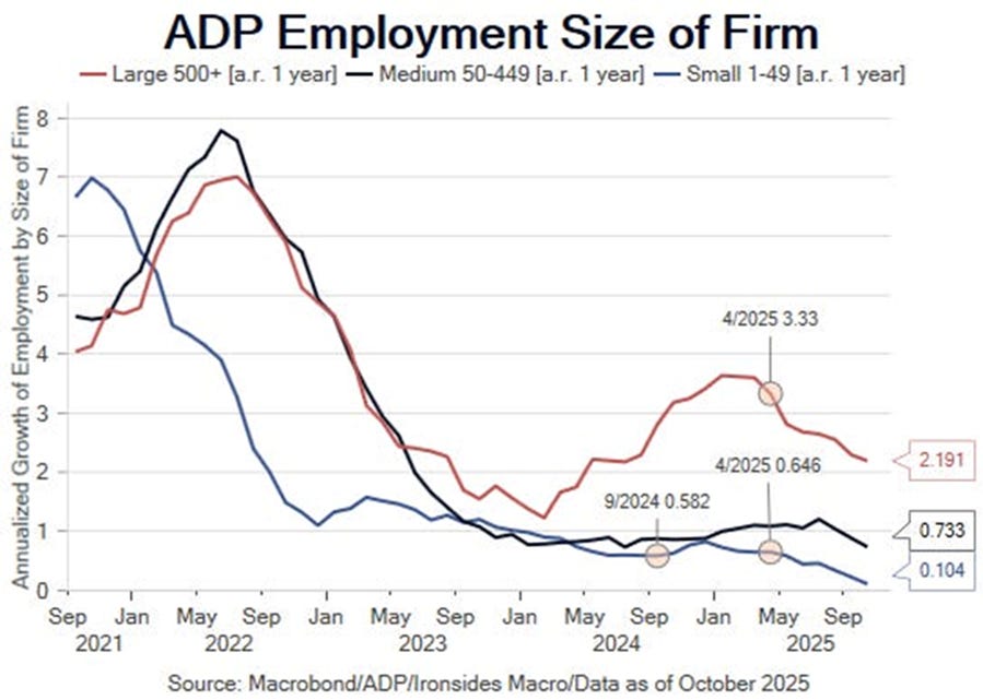 ADP 10 月份的报告虽然略高于预期(下图,也只是统计意义上的),但显示小企业就业持续恶化。