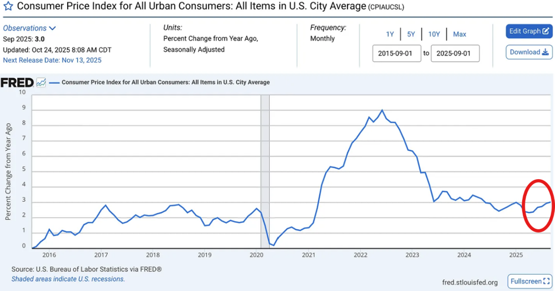 显然市场很喜欢周五的通胀数据。其实这个通胀数据跟过去几个月一直的趋势没有太大的不同,算是在市场的预期之中。通胀CPI继续在3%处胶着,如果看月同比的话,自2025年4月+2.3%触底以来,年化通胀率已经5 个月上涨(见下图)。而股市并不为通胀担心。