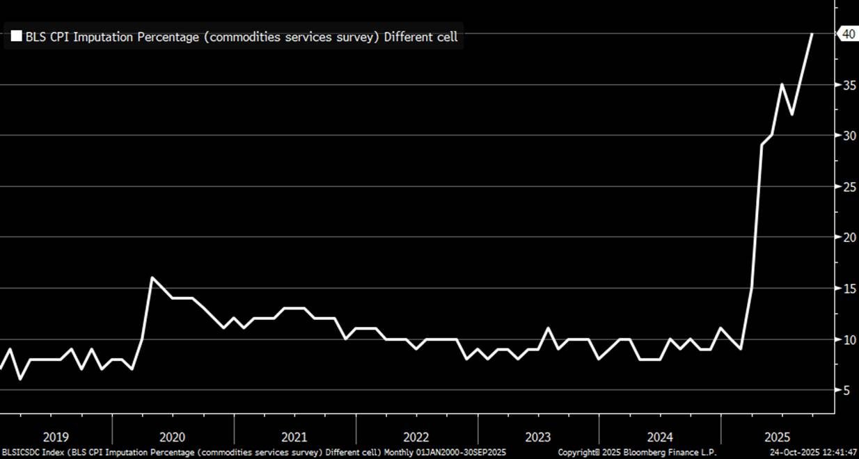这个通胀数据到底多有意义?这还真是个值得商榷的话题。由于联邦政府关门,经济数据收集质量极低。这不是个新闻了。目前CPI数据估算成分为 40%,也就是说计算CPI 数据的输入项有40%是有根据的假设,而并非现实数据,最近有变本加厉的趋势。