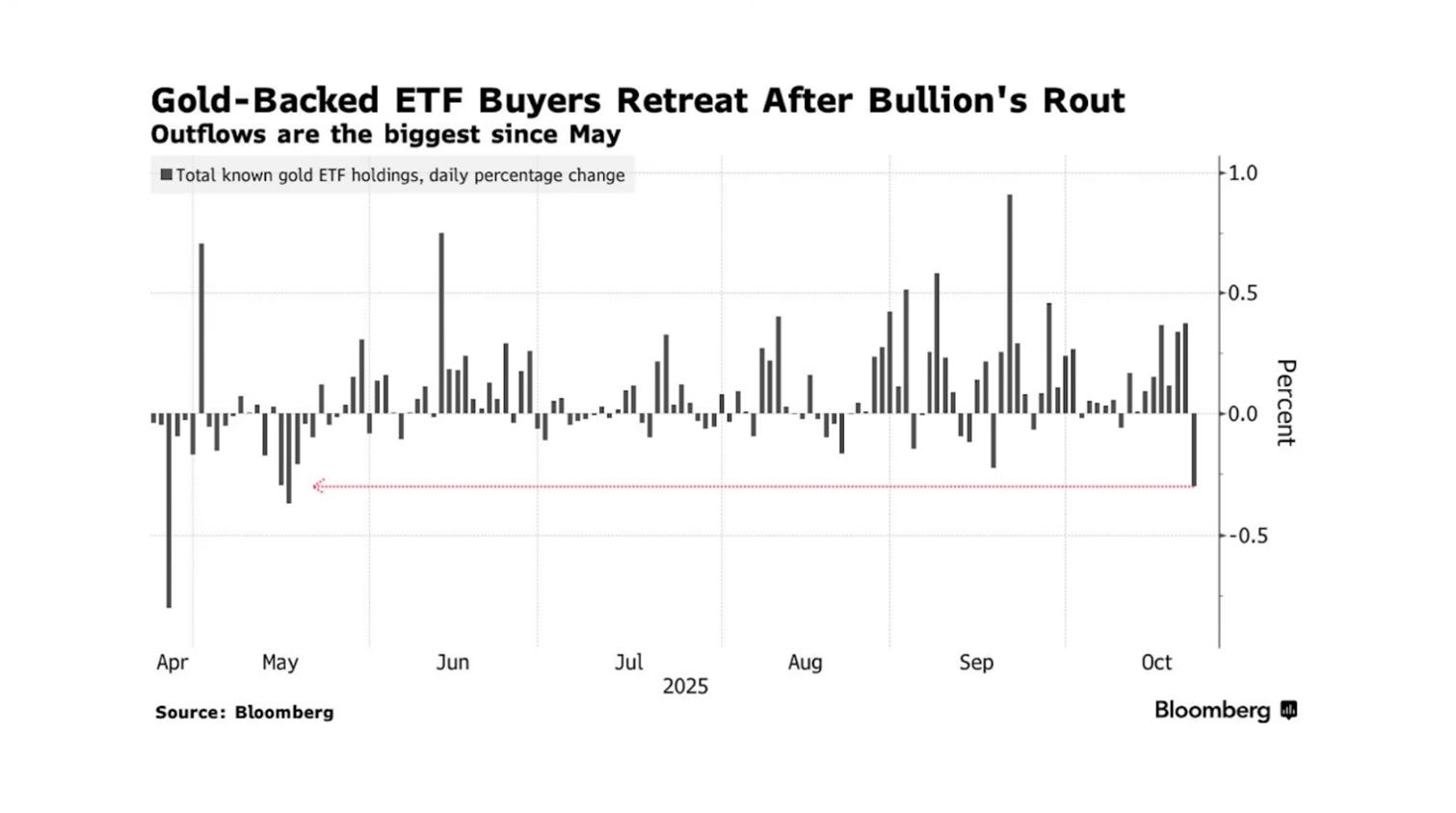 最后,提一嘴黄金。黄金一直是十月的故事。本月前20天,黄金上涨近 500 美元,而后出现了抛物线。毋庸置疑,短期走势过于疯狂,从流入GLD的资金量可以看出(见下图)。可见最近暴涨跟这个流入量(前所未有的水平)高度相关。